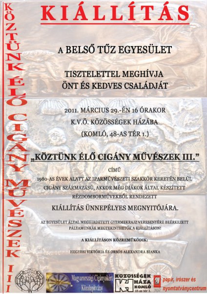 A Belső Tűz Egyesület tisztelettel meghívja Önt és kedves családját 2011. március 29.-én 16 órakor a Közösségek Házába   Köztünk élő cigány művészek III.” című 1980-as évek alatt az iparművészeti szakkör keretén belül cigány származású, akkor még diákok által készített rézdomborművekből rendezett kiállítás ünnepélyes megnyitójára.