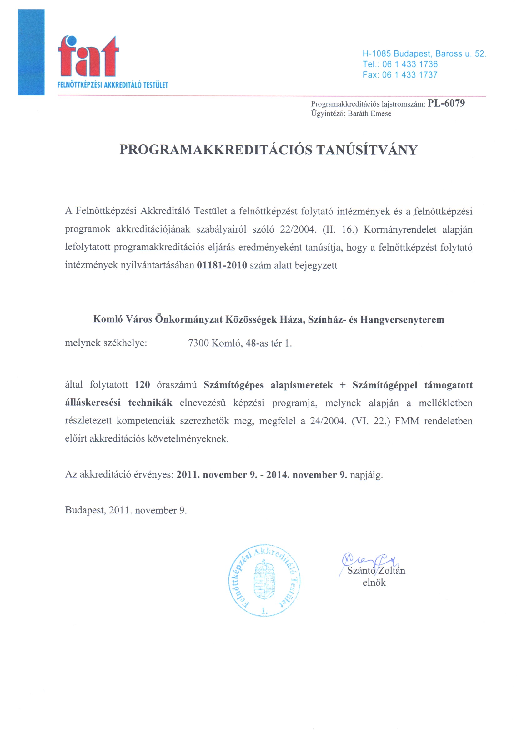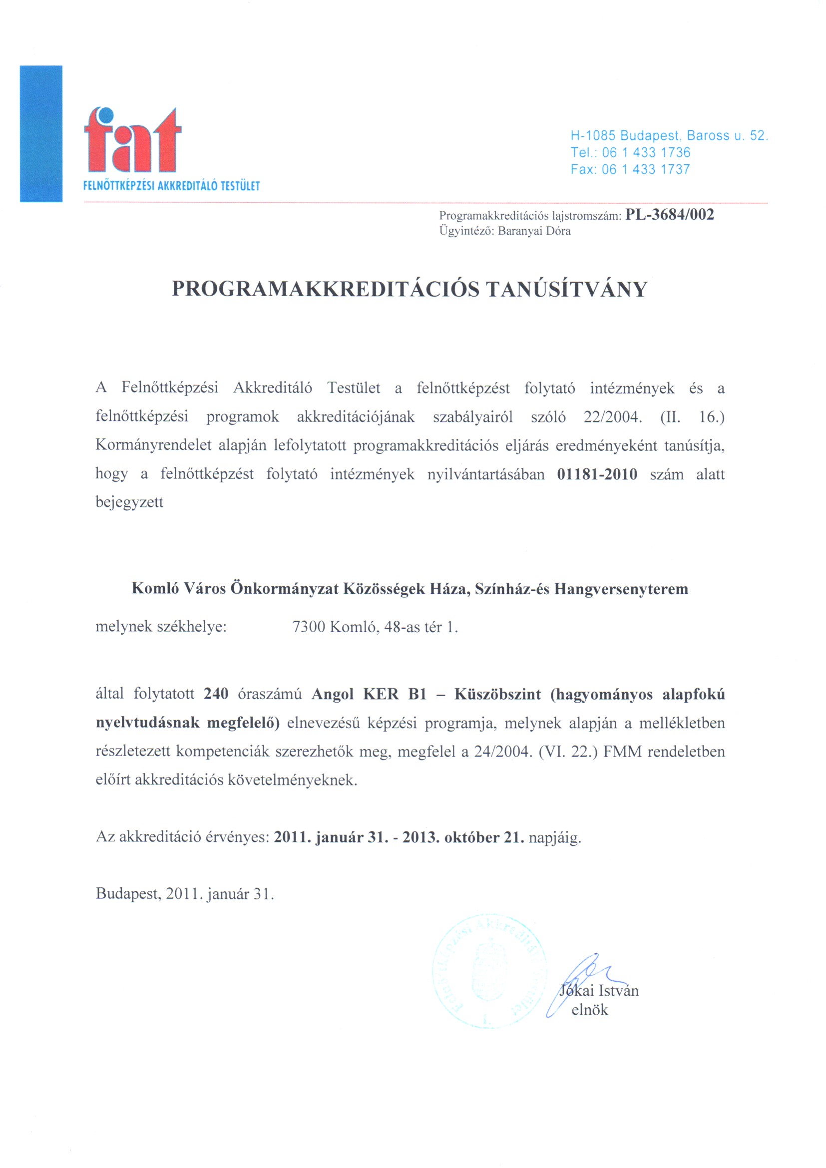 A Közösségek Háza Kapaszkodó - a komlói Közösségek Háza, mint felnőttképzési intézmény (TÁMOP-3.2.3-09/1-2009-0043) - projektje keretében, a pályázatnak megfeleően folyik az akkreditáció.