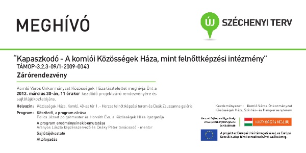 Komló Város Önkormányzat Közösségek Háza tisztelettel meghívja Önt a 2012. március 30-án, 11 órakor kezdődő projektzáró rendezvényére és sajtótájékoztatójára.