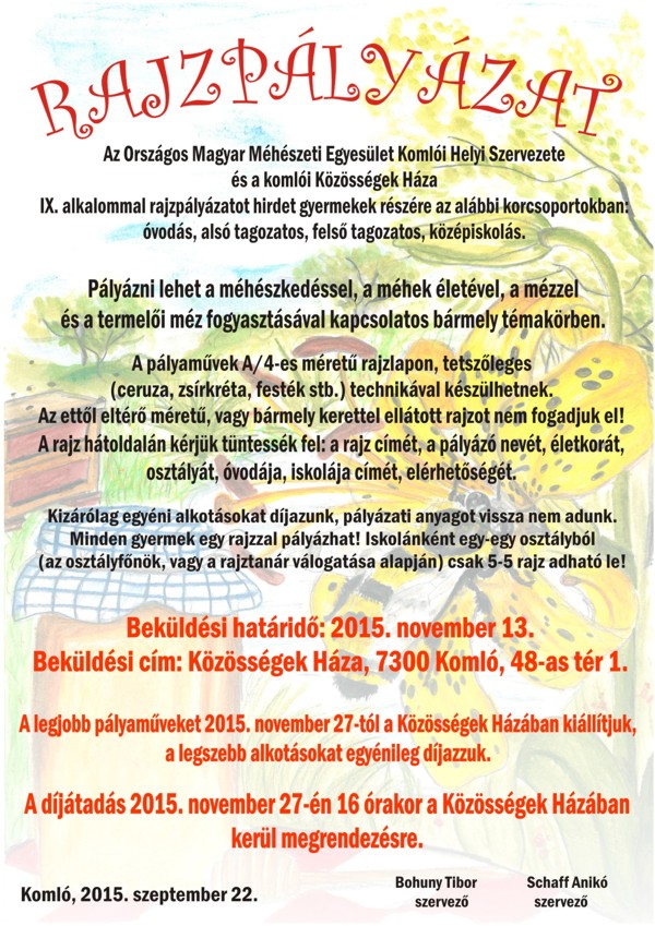 Az Országos Magyar Méhészeti Egyesület Komlói Helyi Szervezete és a komlói Közösségek Háza IX. alkalommal hirdet mézes rajzpályázatot gyermekek részére.