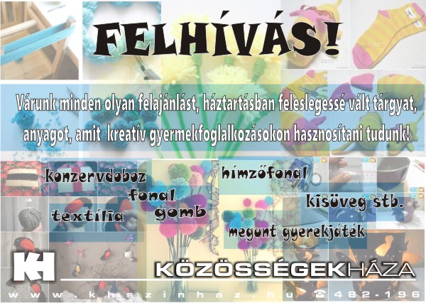Nézz körül a környezetedben és, ha van olyan dolog, ami feleslegessé vált, vagy csak útban van, de a gyerekek még örülnének neki, kérlek juttasd el valamilyen úton-módon a Közösségek Házába! Előre is köszönjük a segítséget! Egy megosztással is sokat segítesz! :-)