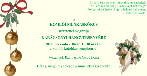 A Komlói Munkáskórus szeretettel meghívja KARÁCSONYI HANGVERSENYÉRE 2016. december 18-án 15.30 órakor a komlói katolikus templomba.