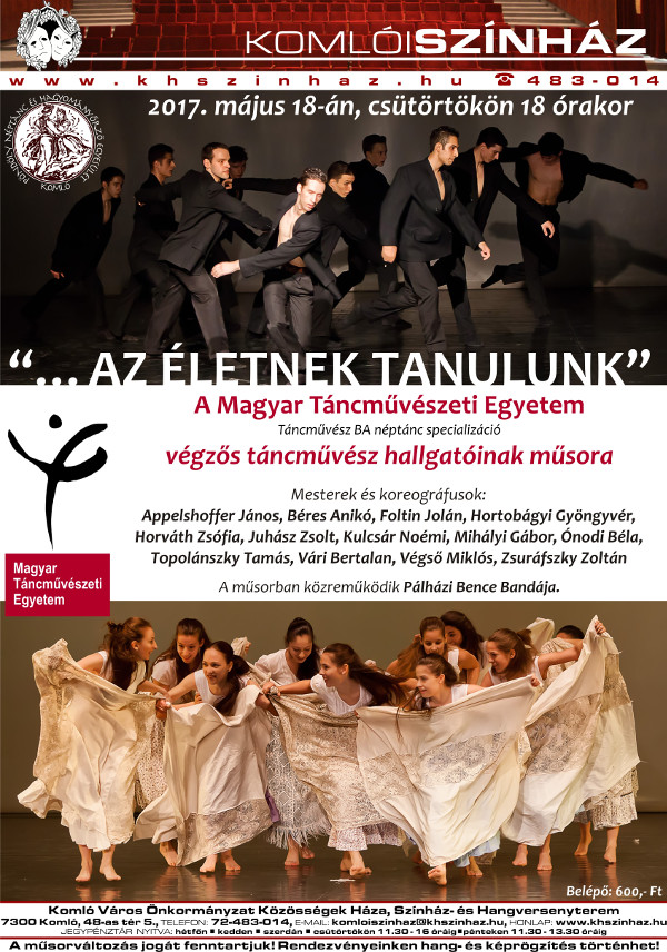 A pályakezdés előtt álló hallgatók tanulmányaik befejezésének csúcspontja a „koncertvizsga”. Ez az előadás jön Komlóra, amely itt kerül először bemutatásra. A műsor két részből áll, melynek első része a műfaji, stílusbeli többszínűséget mutatja be.   A moderntánc-képzés eredményeinek bemutatása mellett – mely Kulcsár Noémi és Topolánszky Tamás nevéhez kötődik –, a hivatásos együttesek és meghívott koreográfusok (Foltin Jolán, Horváth Zsófia, Juhász Zsolt, Mihályi Gábor, Zsuráfszky Zoltán, Vári Bertalan) koreográfiáit vagy azok részleteit adják elő a hallgatók.