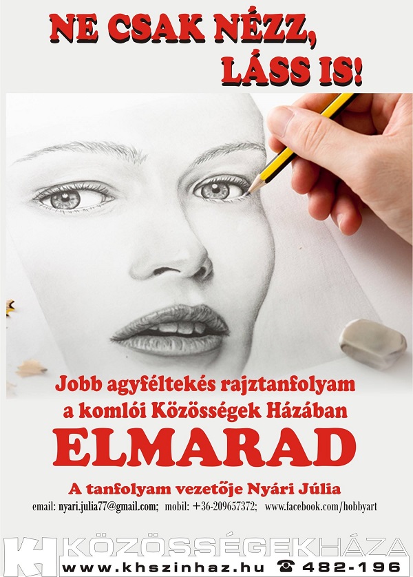 A rossz időjárási viszonyok és a hóhelyzet miatt a jobb agyféltekés rajztanfolyam ELMARAD! Későbbi időpontról Nyári Júliánál, a tanfolyam vezetőjétől lehet érdeklődni!